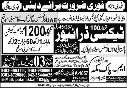 M Pak Makkah Manpower Services is looking for candidates for following posts as per job advertisement published in daily Express Newspaper of March 27, 2022 for location Dubai, dubai Dubai: