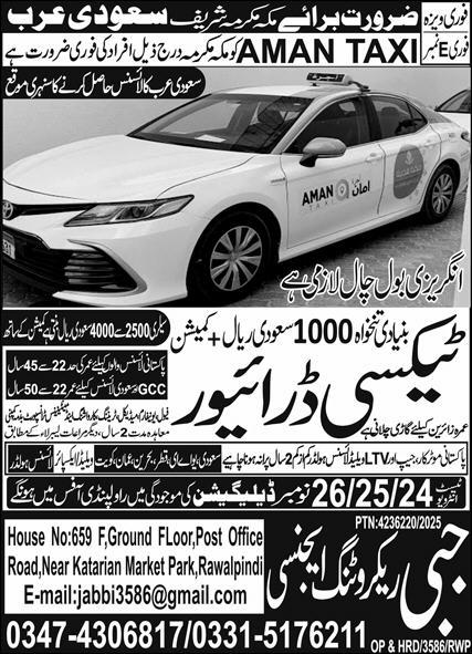 Jabbi Recruiting Agency jobs advertisement dated about 19 November 2025 in daily Express Newspaper invites application for the vacant post of taxi driver, driver and ltv driver in Makkah, madina Saudi Arabia. Persons with Matric and Intermediate etc. education can apply.