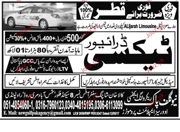 Taxi Drivers are required in Qatar. Recruiting Agency is Newgulf Pak Recruiting Agency Overseas Employment Promoters in Rawalpindi. Ambitious Candidate Send their CV.