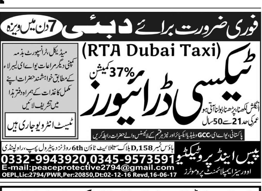 Taxi Drivers are required in Dubai. Food, Medical and Residence will be provided by the Company. Qualified and Experienced Candidate Send their CV Along with All necessary Documents.