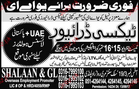 Taxi Drivers are required in UAE Famous Company in UAE. Food, Medical and Residence will be provided by the Company. Test and Interview will be held on 15 and 16 Sep.