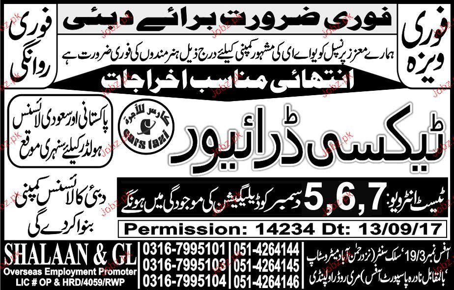 Taxi Drivers are required in Dubai Through SHALAAN & GL Overseas Employment Promoters. Test and Interview will be held in the presence of delegation on 07 December 2017.