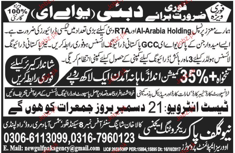 Taxi Drivers are required in Al Arabia Holding Company in Dubai Through New Gulf Recruitment Agency. Test and Interview will be held on 21 December 2017.