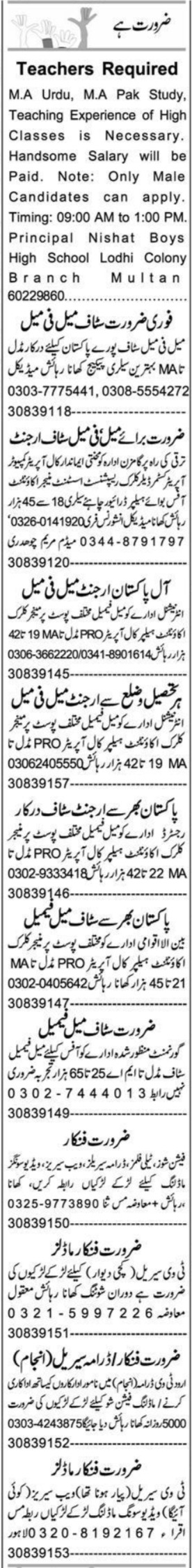 Vacant posts including office staff, pak study teacher, model, management staff, driver, office boy, manager, helper, male female staff, assistant manager, accountant, urdu teacher, receptionist, actor, clerk, computer operator, pro, call operator and customer dealer clerk are announced in Private Multan, multan Punjab Pakistan as per 29 December 2022 advertisement in daily Express Newspaper. Educational qualifications required Bachelor, Middle, Master, Intermediate and Matric etc.