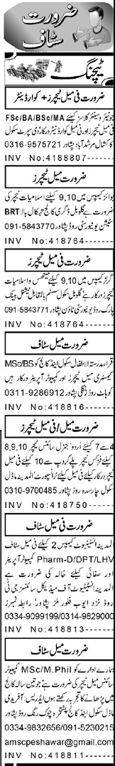 Private School jobs advertisement dated about 20 February 2023 in daily Aaj Newspaper invites application for the vacant post of female urdu teacher, female coordinator, male science teacher, female general science teacher, male islamiat teacher, female subject teacher, male chemistry teacher, female physics teacher, female islamiat teacher, lady health visitor lhv, khala, computer operator and female maths teacher in Peshawar, peshawar Khyber Pakhtunkhwa KPK Pakistan. Candidates with MA, Matric, Intermediate, M.sc, BA and Pharma D etc. educational background will be preferred.
