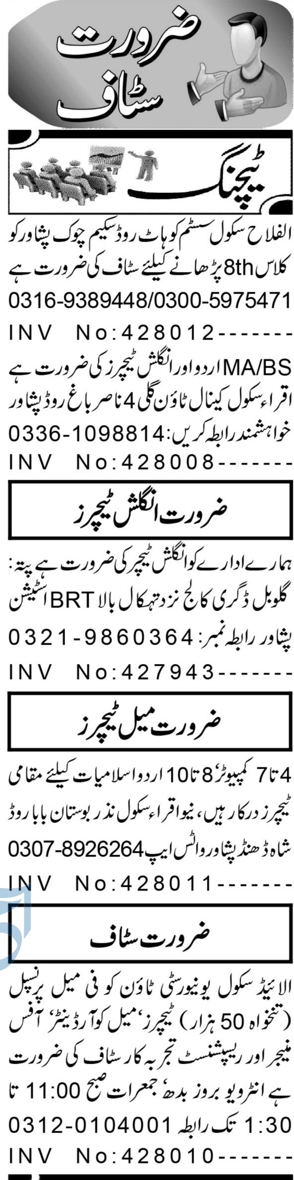 Private School jobs advertisement dated about 10 January 2024 in daily Aaj Newspaper invites application for the vacant post of islamiat teacher, receptionist, male coordinator, english teacher, female principal, office manager, subject teacher, urdu teacher and eighth class teacher in Peshawar, peshawar Khyber Pakhtunkhwa KPK Pakistan. Educational qualifications required M.sc, MA and BA etc.