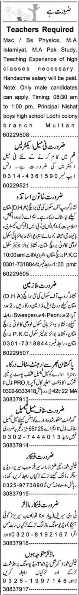Vacant posts including sweeper, model, female maths teacher, pro, call operator, physics teacher, manager, accountant, peon, female english teacher, actor, pak studies teacher, female biology teacher, islamiat teacher, female urdu teacher, female islamiat teacher, female actress, female chemistry teacher, helper, clerk and female physics teacher are announced in Private Multan, multan Punjab Pakistan as per 16 December 2022 advertisement in daily Express Newspaper. Preferred Education is Master, Intermediate, Matric, Bachelor and Middle etc.