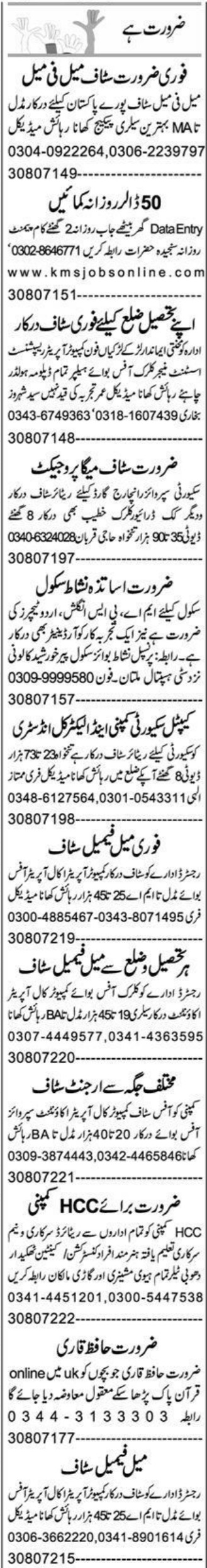 Vacant posts including quran teacher, assistant manager, computer call operator, call operator, receptionist, computer operator, data entry operator, teacher, security staff, clerk, account supervisor, driver, cook, accountant, office boy, helper, security supervisor, coordinator, qari, khateeb, incharge guard, english teacher and urdu teacher are announced in Private Company Multan, multan Punjab Pakistan as per 24 February 2022 advertisement in daily Express Newspaper. Preferred Education is Matric, Intermediate, Bachelor and Middle etc.