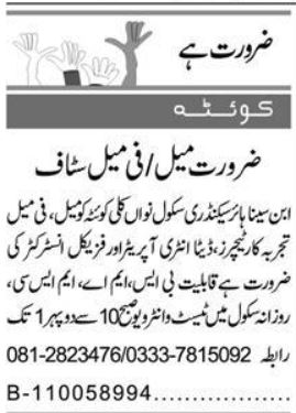 Ibn e Sina Public High School is looking for candidates for following posts as per job advertisement published in daily Express Newspaper of February 25, 2025 for location Nawai Killi Bhittani Quetta, quetta Balochistan Pakistan: