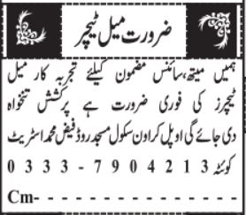 Opal Crown School OCS Prince Road Quetta, quetta Balochistan Pakistan invites applications from eligible candidates for the post of maths teacher, science teacher and teacher as per advertisement of August 27, 2025 published in daily Jang Newspaper. Preferred Education is Bachelor and Master etc.