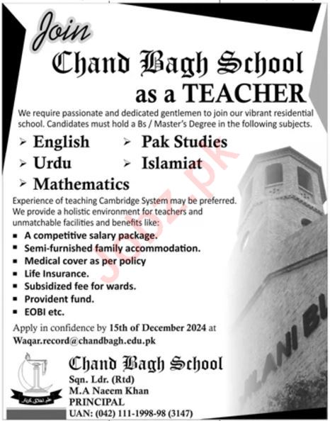 Chand Bagh School is looking for candidates for following posts as per job advertisement published in daily Jang Newspaper of December 1, 2024 for location Lahore, lahore Punjab Pakistan: