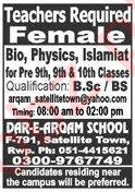 Vacant posts including physics teacher, biology teacher and islamiat teacher are announced in Dar e Arqam School Rawalpindi, rawalpindi Punjab Pakistan as per 2 September 2024 advertisement in daily Jang Newspaper. Educational qualifications required etc.