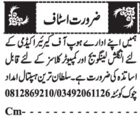 Education Quetta, quetta Balochistan Pakistan invites applications from eligible candidates for the post of computer teacher and english teacher as per advertisement of August 2, 2023 published in daily Jang Newspaper. Educational qualifications required M.sc and MA etc.