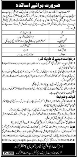 Literacy and Non Formal Basic Education Department Muzaffargarh, dera ghazi khan, bahawalpur, rajanpur, rahim yar khan, taunsa sharif and muzaffargarh Punjab Pakistan invites applications from eligible candidates for the post of teacher as per advertisement of November 25, 2022 published in daily Khabrain Newspaper. Candidates with Intermediate etc. educational background will be preferred.
