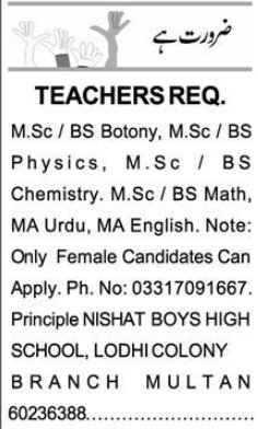 Nishat Boys High School jobs advertisement dated about 27 June 2023 in daily Express Newspaper invites application for the vacant post of physics teacher, maths teacher, chemistry teacher, urdu teacher, english teacher and science teacher in Multan, multan Punjab Pakistan. Preferred Education is MA and M.sc etc.