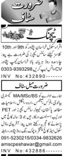 Private School Peshawar, peshawar Khyber Pakhtunkhwa KPK Pakistan invites applications from eligible candidates for the post of pakistan studies teacher, urdu teacher, lab assistant, maths teacher, physics teacher, biology teacher, chemistry teacher, islamiat teacher, science teacher, computer science teacher and english teacher as per advertisement of July 24, 2024 published in daily Aaj Newspaper. Candidates with Bachelor and Master etc. educational background will be preferred.
