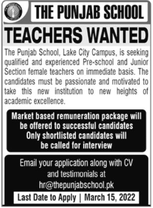 The Punjab School invites applications for job positions advertised in daily Jang dated 27 February 2022 for following vacancies in Lahore, lahore Punjab Pakistan.