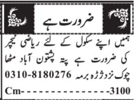 Private School Quetta, quetta Balochistan Pakistan invites applications from eligible candidates for the post of mathematics teacher and teacher as per advertisement of September 12, 2023 published in daily Jang Newspaper. Persons with M.sc, Bachelor and Master etc. education can apply.