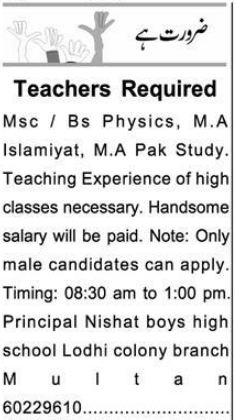 Nishat Boys High School jobs advertisement dated about 19 December 2022 in daily Express Newspaper invites application for the vacant post of pak study teacher, islamiat teacher and physics teacher in Multan, multan Punjab Pakistan. MA and M.sc etc. educational qualification will be preferred.