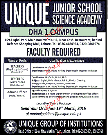 Teachers And Admin Officers Job In Unique School