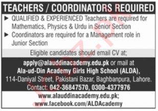 Ala Ud Din Academy Lahore, lahore Punjab Pakistan invites applications from eligible candidates for the post of maths teacher, teacher, physics teacher, urdu teacher and coordinator as per advertisement of July 31, 2022 published in daily Jang Newspaper. Persons with B.ed and Master etc. education can apply.