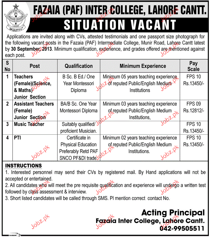 Teachers and PTI Jobs in Fazaia Inter College Lahore