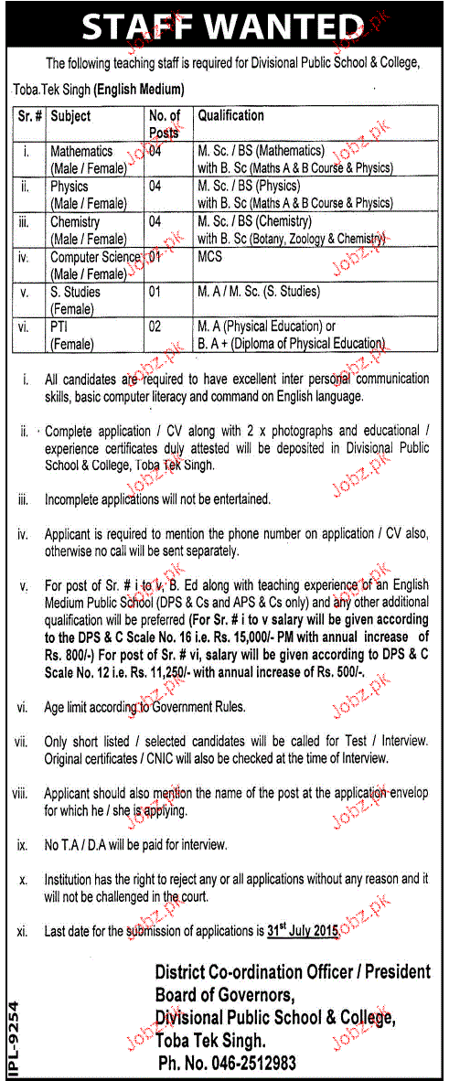 Latest Government Teaching Posts Toba Tek Singh 2025