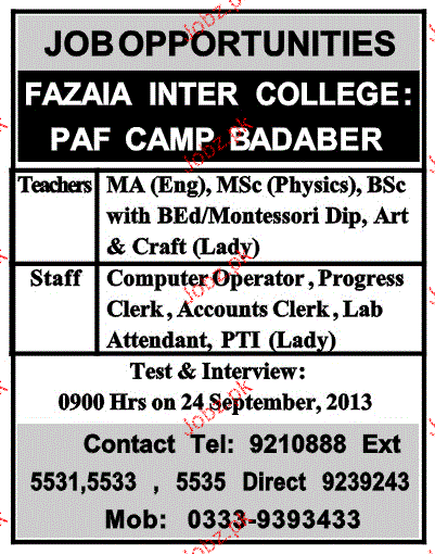 Teachers, Computer Operators Jobs In Fazaia Inter College