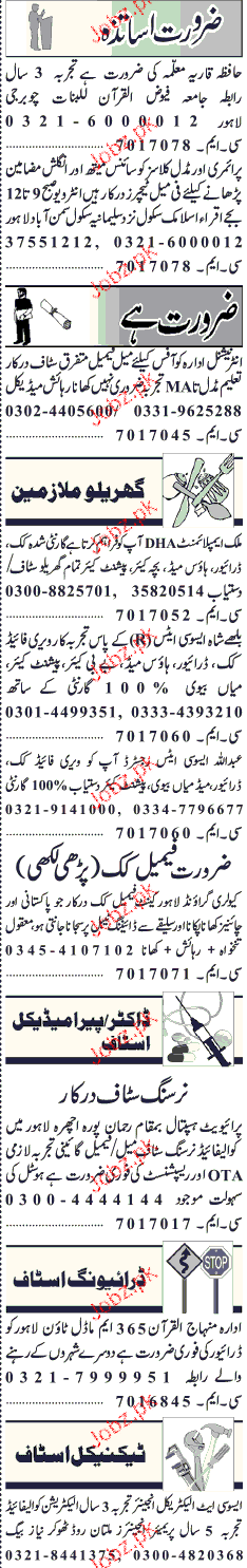 Teachers, Drivers, Chawkidars, Cook And Receptionist Wanted