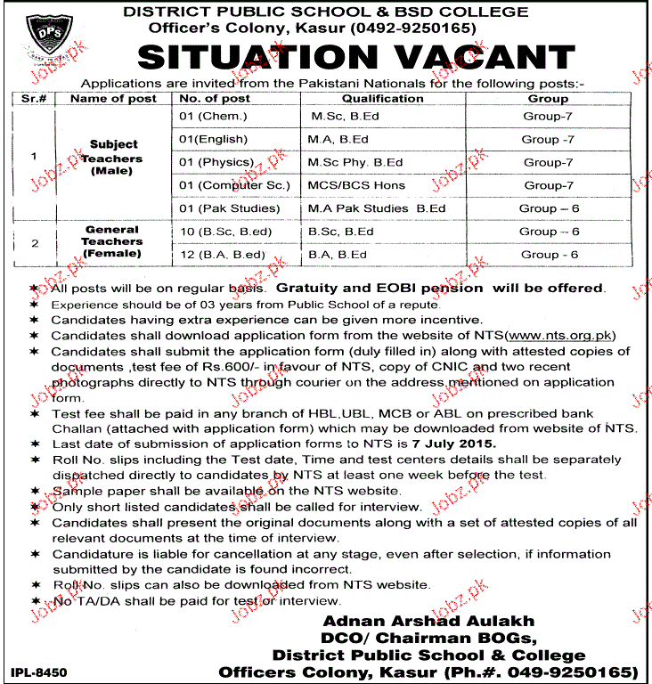 Apply as per details in job advertisement. Login to view further details of how to apply via https://www.jobz.pk online.