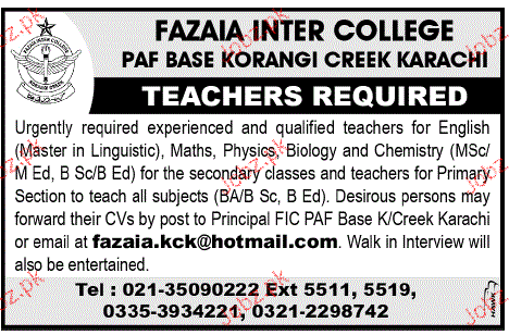 Teachers Job In Fazaia Inter College