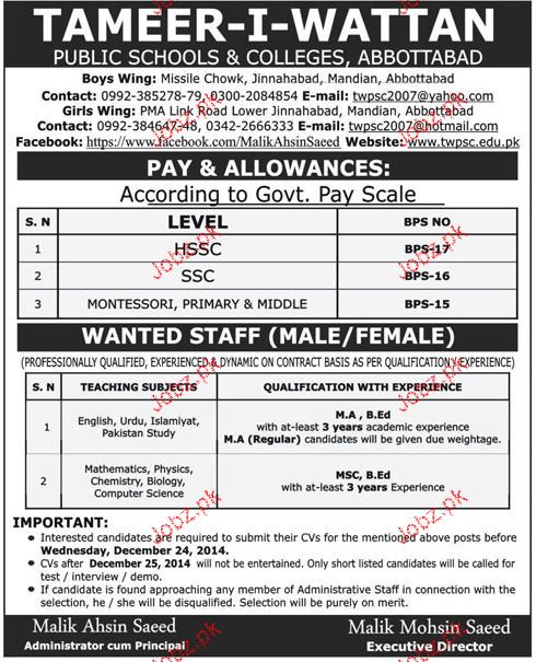 Teachers Job in Tameer-i-Watan Public Schools & College