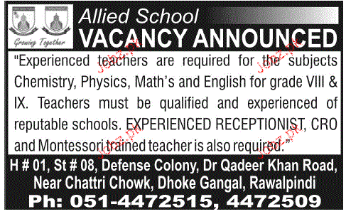 Teachers are required in Allied School in Rawalpindi.