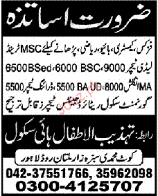 Teachers are Required in Tehzeeb Itfall High School in Lahore