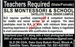 Teachers are required in SLS Montessori & School in Rwalpndi.