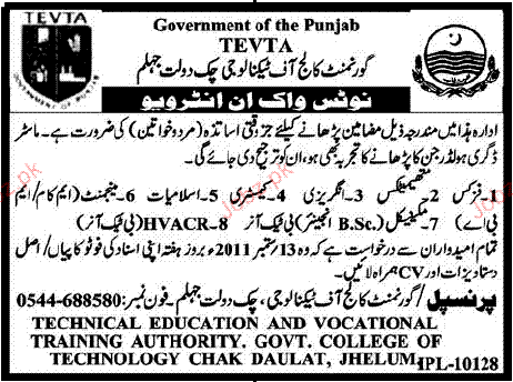 Latest Technical Education and Vocational Training Authority TEVTA Other Posts Jhelum 2025