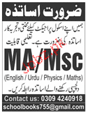 Teachers For the Subject of English, Urdu, Physics and Maths ar required in Lahore. Send your Application along with Educational certificates, Domicile, Copy of CNIC and Recent Photographs.