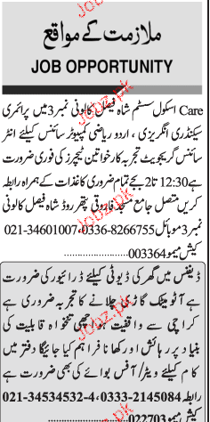 Teachers For the Subject of English, Urdu, Computer Sciences and Drivers are required in Karachi. Having Minimum 2 to 3 years Working Experience in relevant field.
