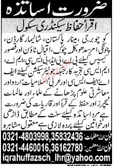 Teachers are required in Iqra Haffaz Secondary School in Lahore