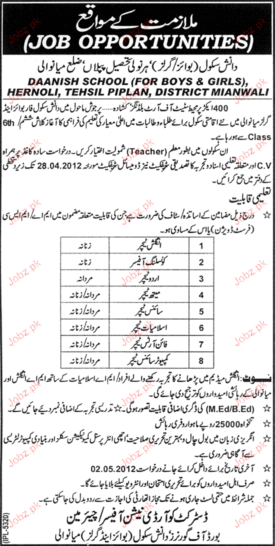 Latest Government Teaching Posts Mianwali 2025
