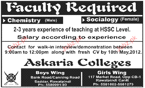 Teachers are required in Askaria College in Rawalpindi