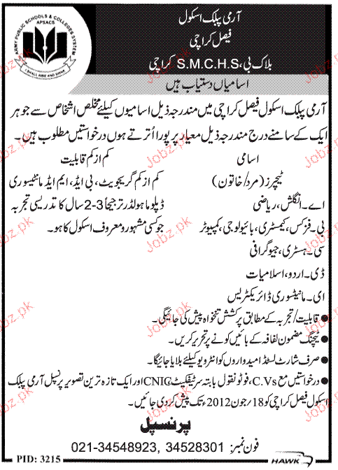 Latest Army Public School APS Teaching Posts Karachi 2025