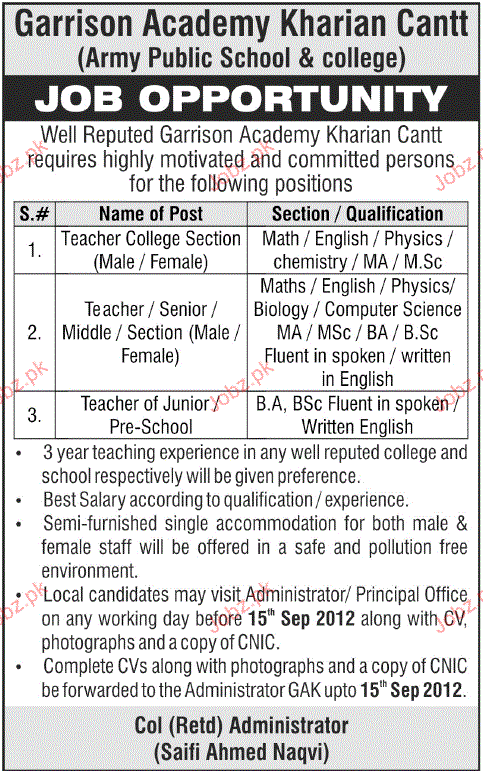 Latest Army Public School APS Teaching Posts Kharian 2025