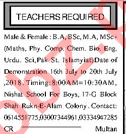 Latest Nishat Boys High School Teaching Posts Multan 2025