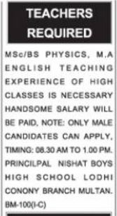 Vacant posts including teacher, physics teacher and english teacher are announced in Nishat Boys High School Multan, multan Punjab Pakistan as per 22 September 2022 advertisement in daily Nawaiwaqt Newspaper. Persons with Bachelor and Master etc. education can apply.