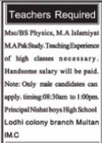 Teachers Jobs 2023 in Nishat Boys High School Multan