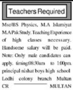 Vacant posts including pak study teacher, female teacher, physics teacher, islamiyat teacher and teacher are announced in Nishat Boys High School Multan, multan Punjab Pakistan as per 15 December 2022 advertisement in daily Khabrain Newspaper. Preferred Education is Intermediate, Bachelor and Master etc.