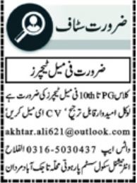 Al Falah International School System Par Hoti Mardan, mardan Khyber Pakhtunkhwa KPK Pakistan invites applications from eligible candidates for the post of female teacher and teacher as per advertisement of April 15, 2025 published in daily Mashriq Newspaper. Educational qualifications required Master and Bachelor etc.
