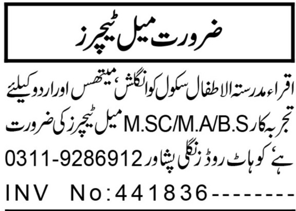 Iqra Madrassa Tul Atfal School & College jobs advertisement dated about 24 May 2025 in daily Aaj Newspaper invites application for the vacant post of english teacher, maths teacher, teacher and urdu teacher in Kohat Road Peshawar, peshawar Khyber Pakhtunkhwa KPK Pakistan. Educational qualifications required Master, MA, Bachelor and M.sc etc.