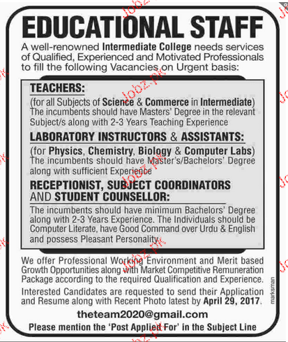 Apply as per details in job advertisement. Login to view further details of how to apply via https://www.jobz.pk online.